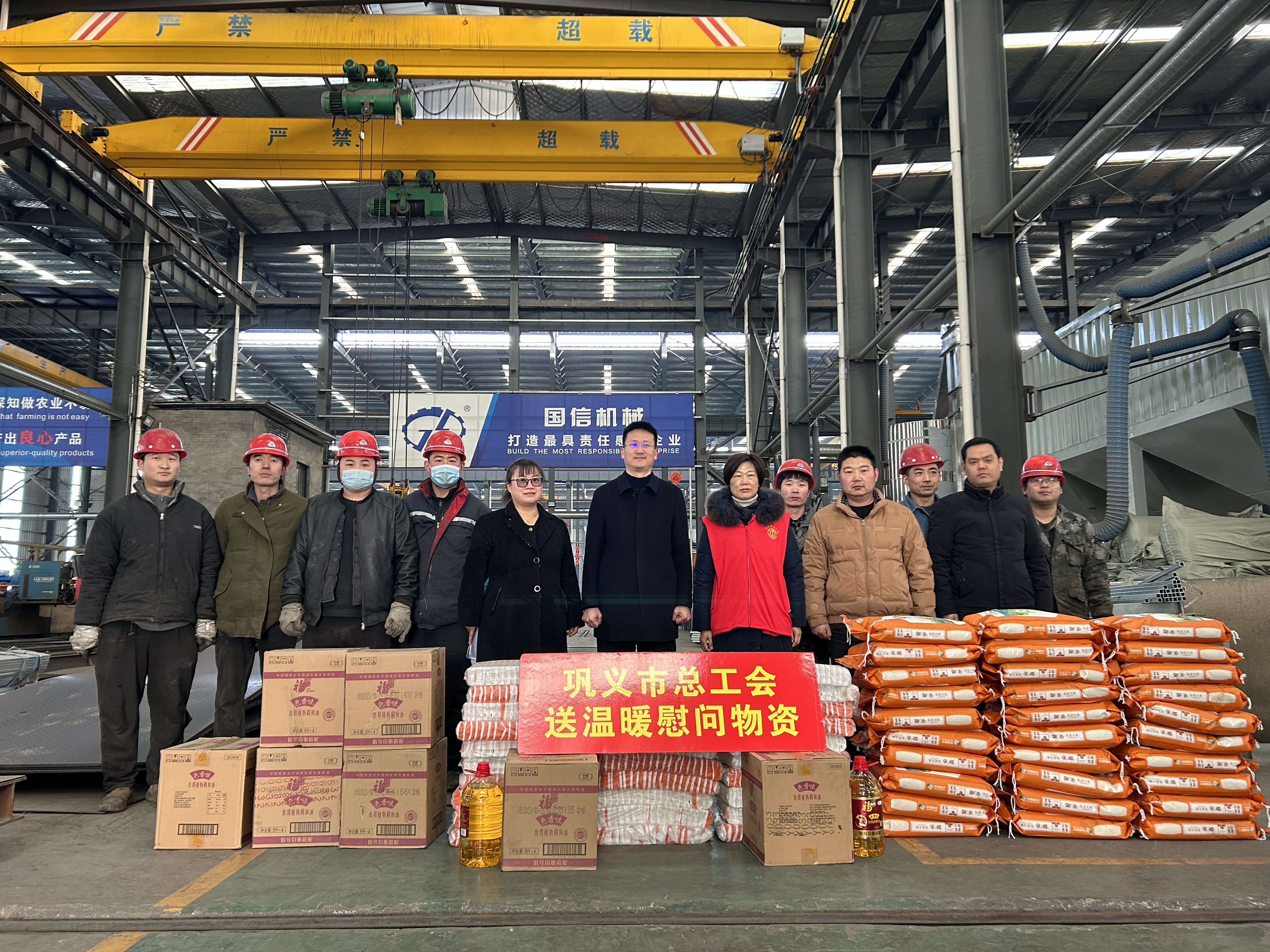 2024年1月23日,臨近年關,市工會不懼嚴寒,帶隊慰問國信機械。工會攜物資,米、面、油、掛面等,來我廠送溫暖慰問一線職工,以此表達對我廠的關心和問候。 企業負責人紛紛表示,將錨定目標任務